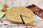 Den Teig aus dem Kühlschrank nehmen. Anschließend zwischen zwei Lagen Backpapier vorsichtig ausrollen und in eine Tarteform von ca. 24 cm Durchmesser geben. Dann mit den Händen den Teig so formen, dass die Tarteform ausgekleidet ist. Anschließend den Teig an mehreren Stellen mit einer Gabel einstechen.