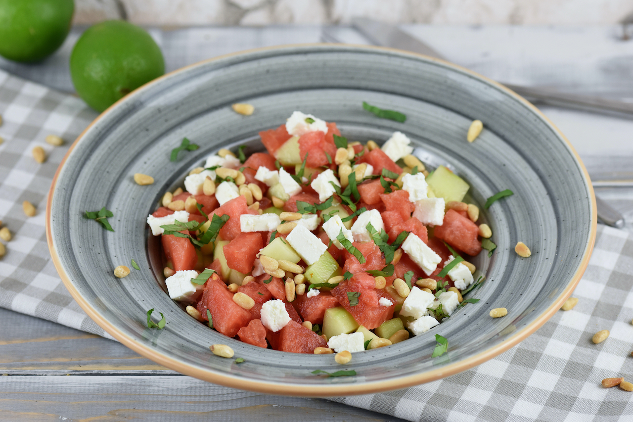 Wassermelonen-Feta-Salat mit Gurke, Minze und Pinienkernen